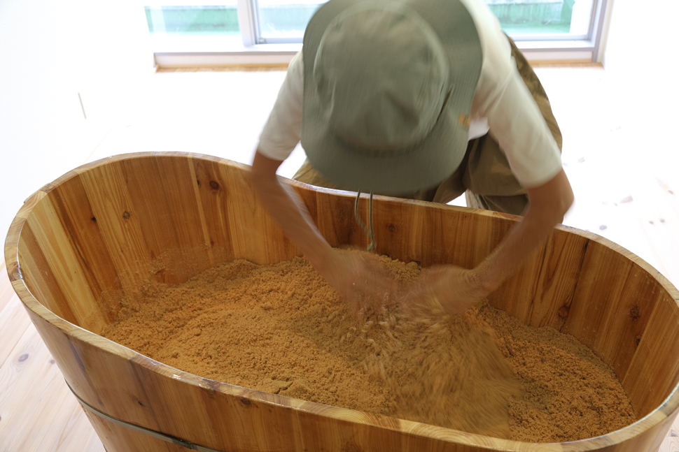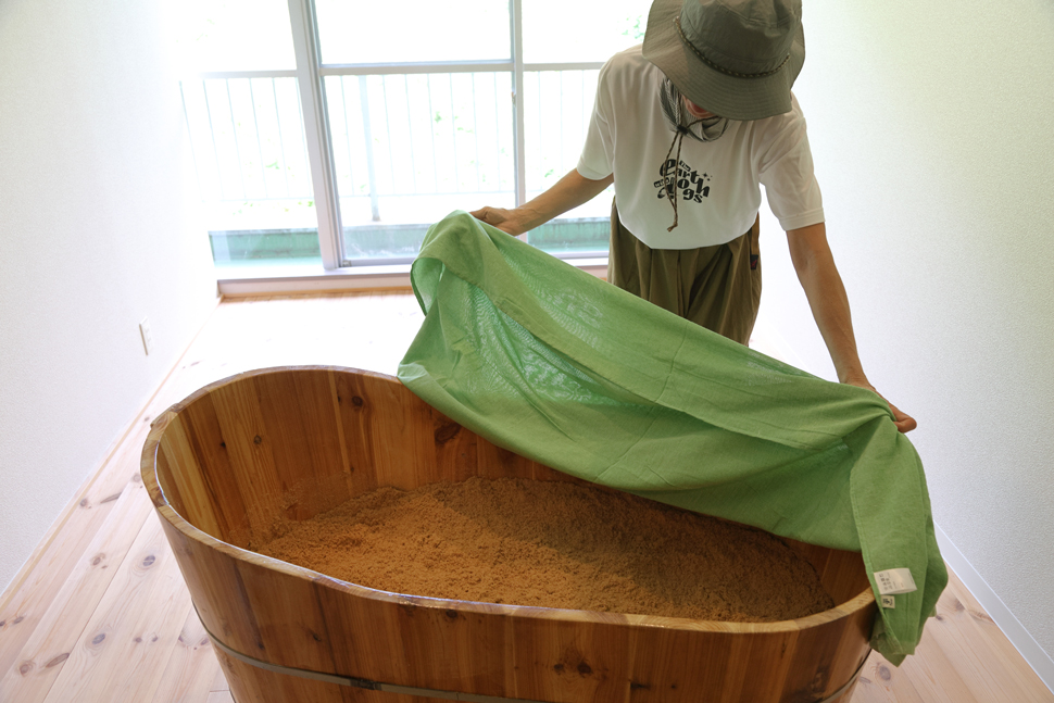 酵素風呂は、発酵した米ぬかとおがくずの温もりで